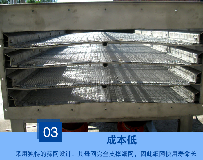 作為為常見的一種振動篩,采用獨特的篩網設計,其母網完全支撐細網,因此細網使用壽命長,降低了細網的耗材使用,長時間的生產可降低諸多成本,方便和快速更換篩網 。